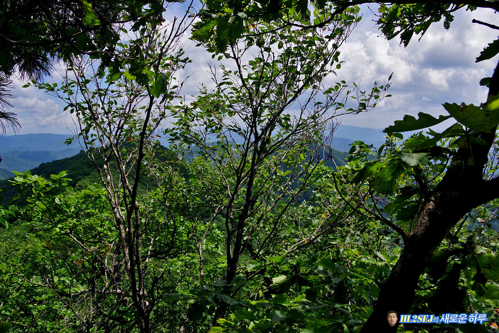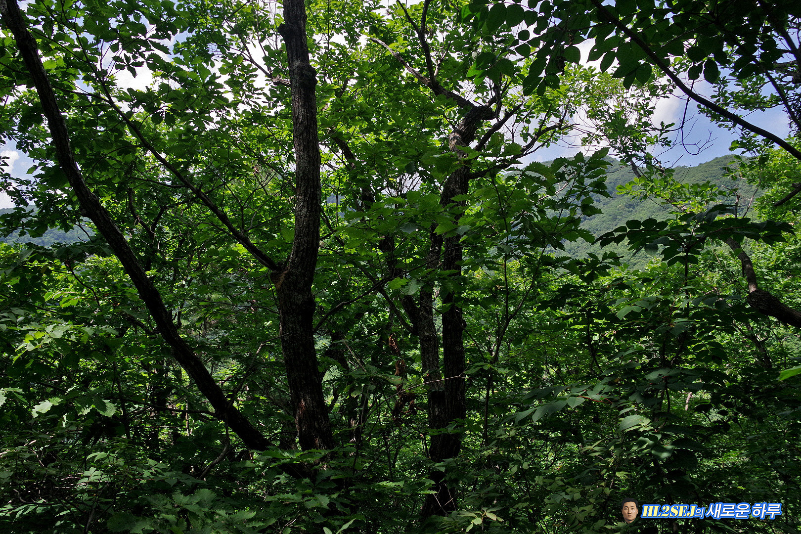 ▼ 숲 사이로 겨우 보이는 건너편 각화산 정상부. ▼